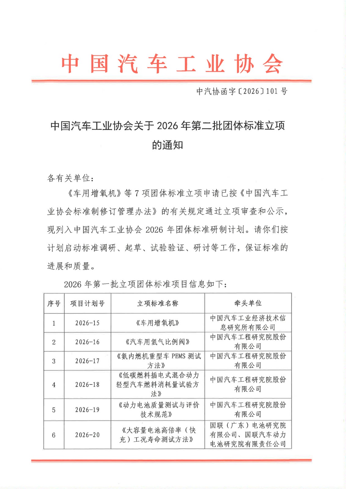 中国汽车工业协会关于2026年第二批团体标准立项通知