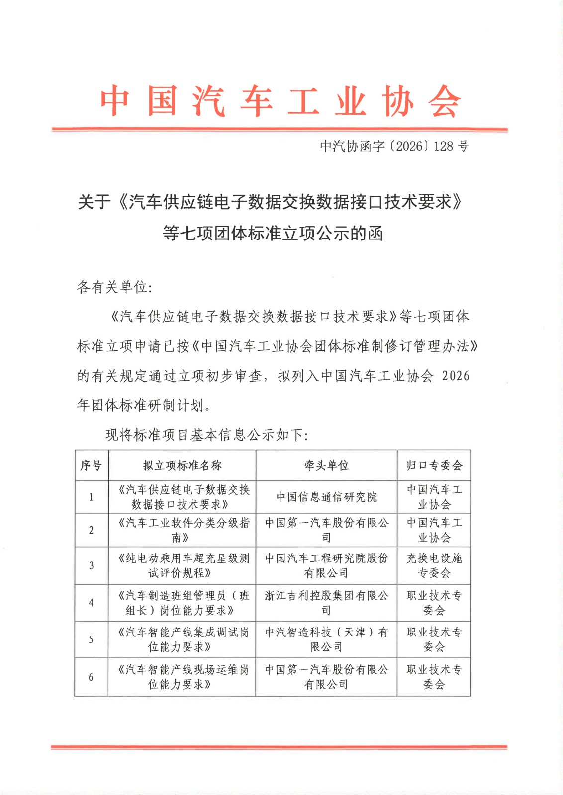 中国汽车工业协会关于2026年第二批团体标准立项通知