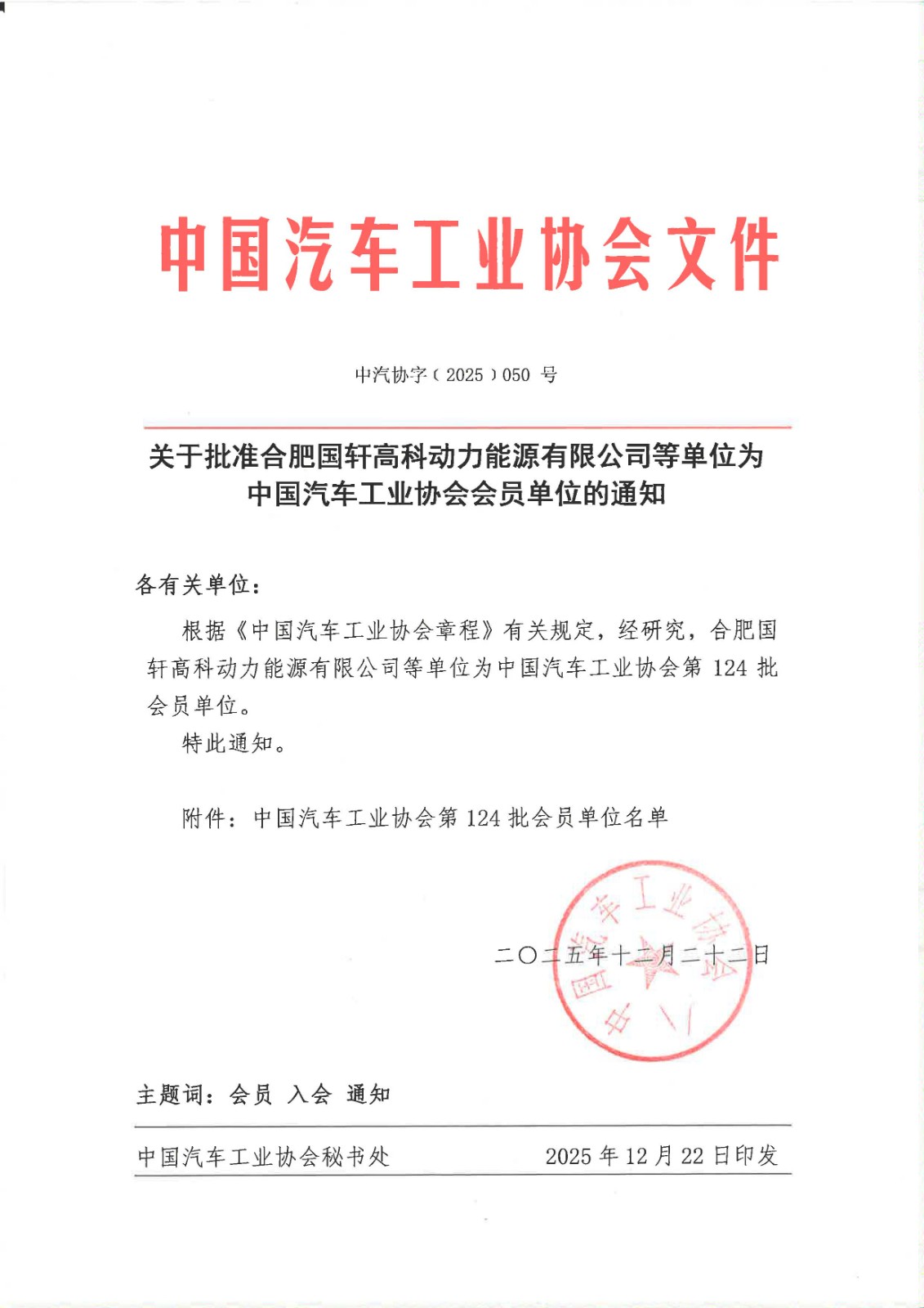 关于批准合肥国轩高科动力能源有限公司等单位为中国汽车工业协会会员单位的通知