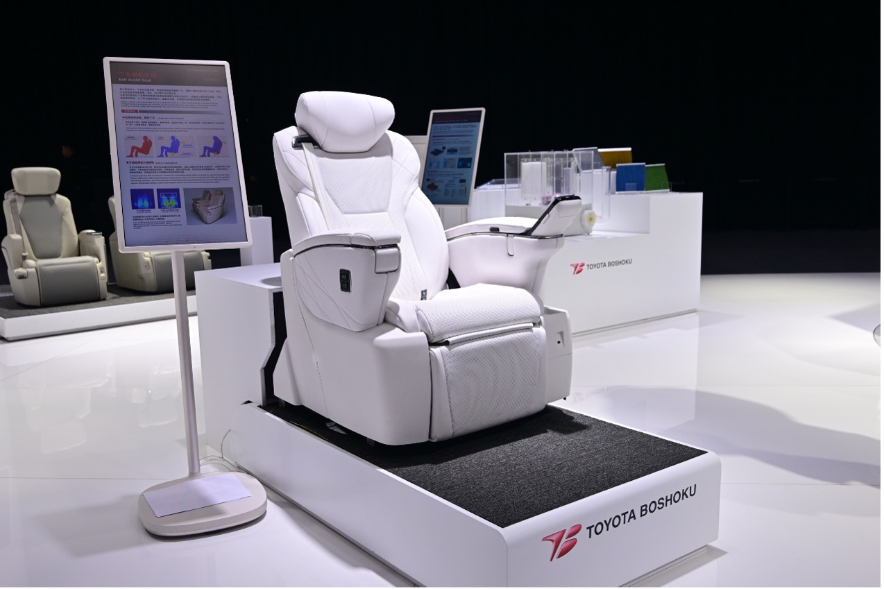 在全球智研展示区域,丰田纺织展示了零重力座椅的乘员保护技术和下车辅助座椅。在零重力座椅逐渐成为主流的当下,丰田纺织通过座椅、头枕与安全带等约束系统的协同控制,在碰撞瞬间引导乘员姿态回归安全状态,有效降低头部、胸部与颈部的伤害风险,在保障舒适体验的同时,实现面向自动驾驶时代的安全防护升级。与此同时,丰田纺织还研发了下车辅助座椅,通过智能坐姿调整与座椅自动抬升,显著减少腿部弯折角度,引导身体自然起身,让下车过程更加省力、顺畅与优雅,全面提升出行的友好度与舒适性。值得注意的是,丰田纺织还带来了“晕车预测·抑制系统”,系统将在乘员身体不适前主动对颈部进行降温,利用颈部对温度敏感的特点有效抑制眩晕发生,专注享受车内时光。